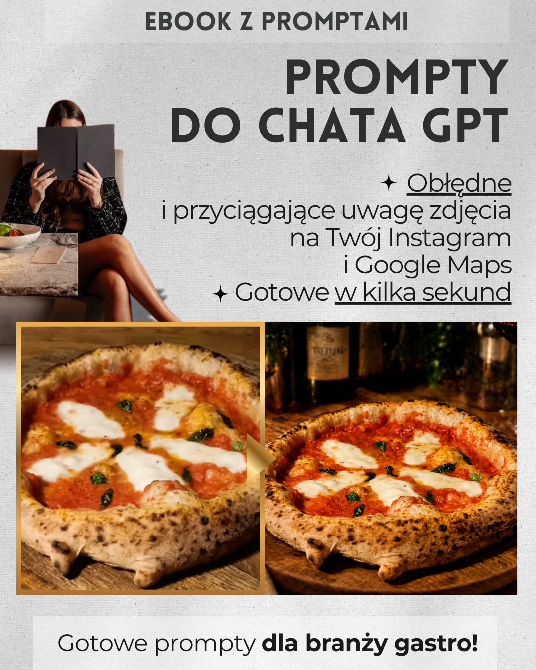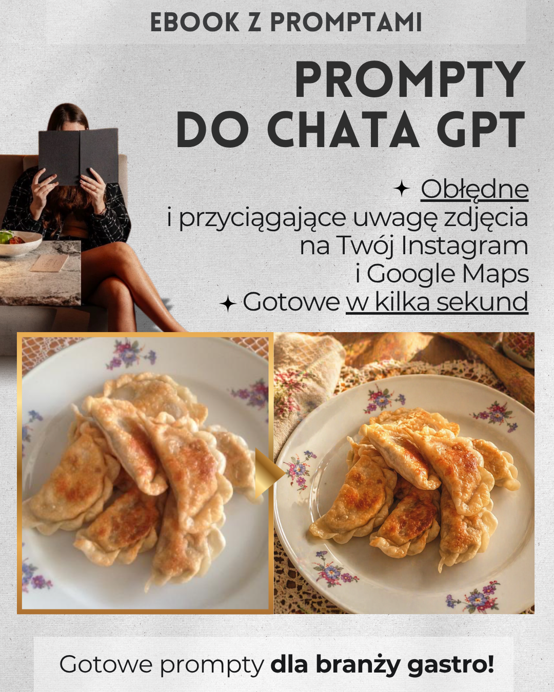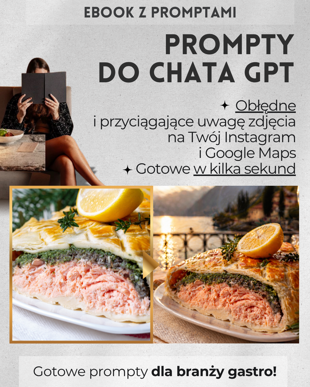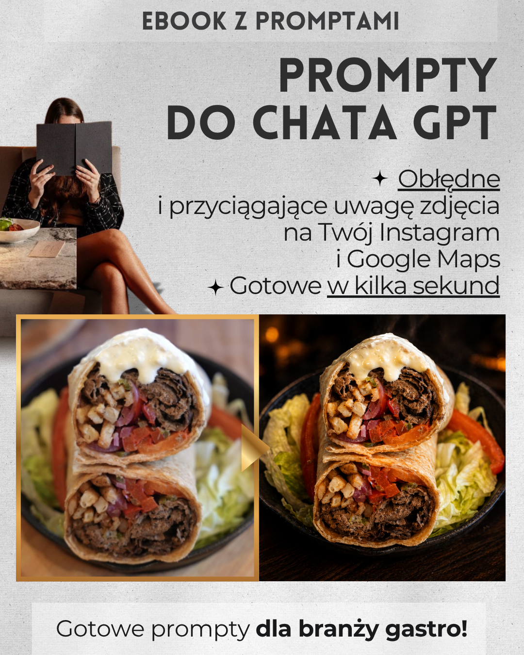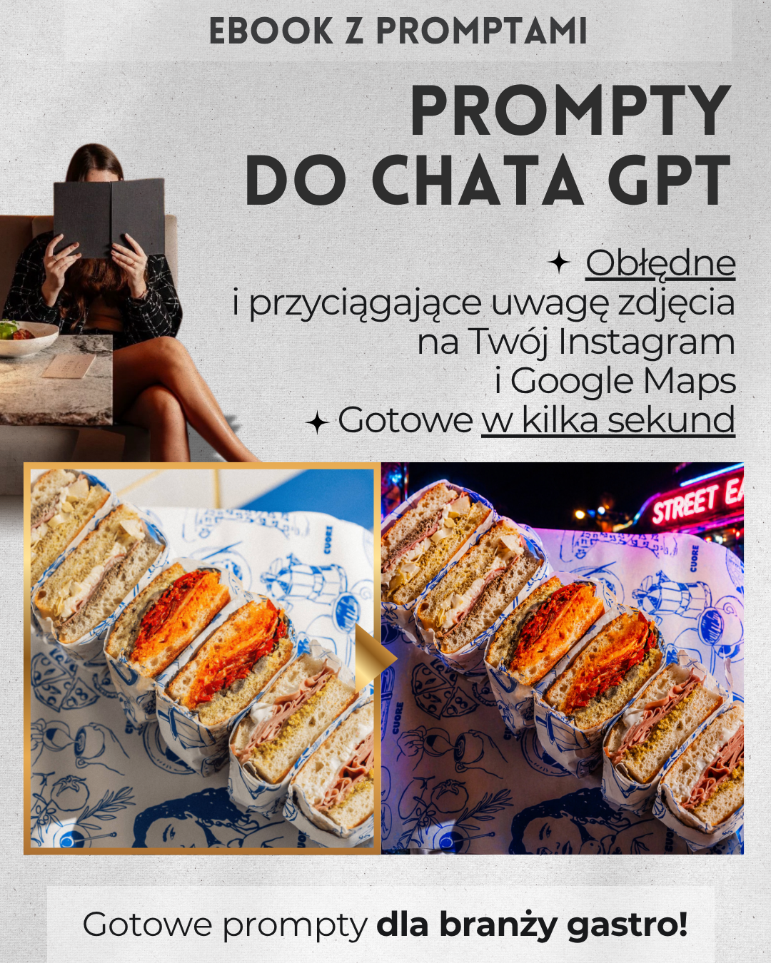 To praktyczny eBook z 28 gotowymi promptami AI, dzięki którym zwykłe zdjęcia z telefonu mogą wyglądać jak profesjonalne fotografie reklamowe restauracji. Bez studia. Bez aparatu za tysiące. Bez fotografa. Bez wiedzy technicznej. Po prostu:- ✅ robisz zdjęcie